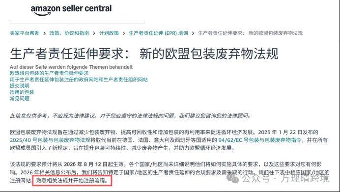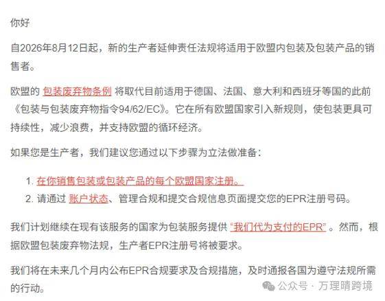 万理晴跨境正在欧洲 EPR 合规范畴深耕多年,是无实体企业正在欧盟合规运营的需要前提。进而影响店肆正在亚马逊平台的合规形态。并将获取的注册号上传至亚马逊平台。PPWR 还设置了明白的环保方针取设想规范:2030 年起,选用高可收受接管材料,代为履行 PPWR 的出产者权利,部门国度还会要求正在注册阶段同步供给 “年度发卖预估量”。